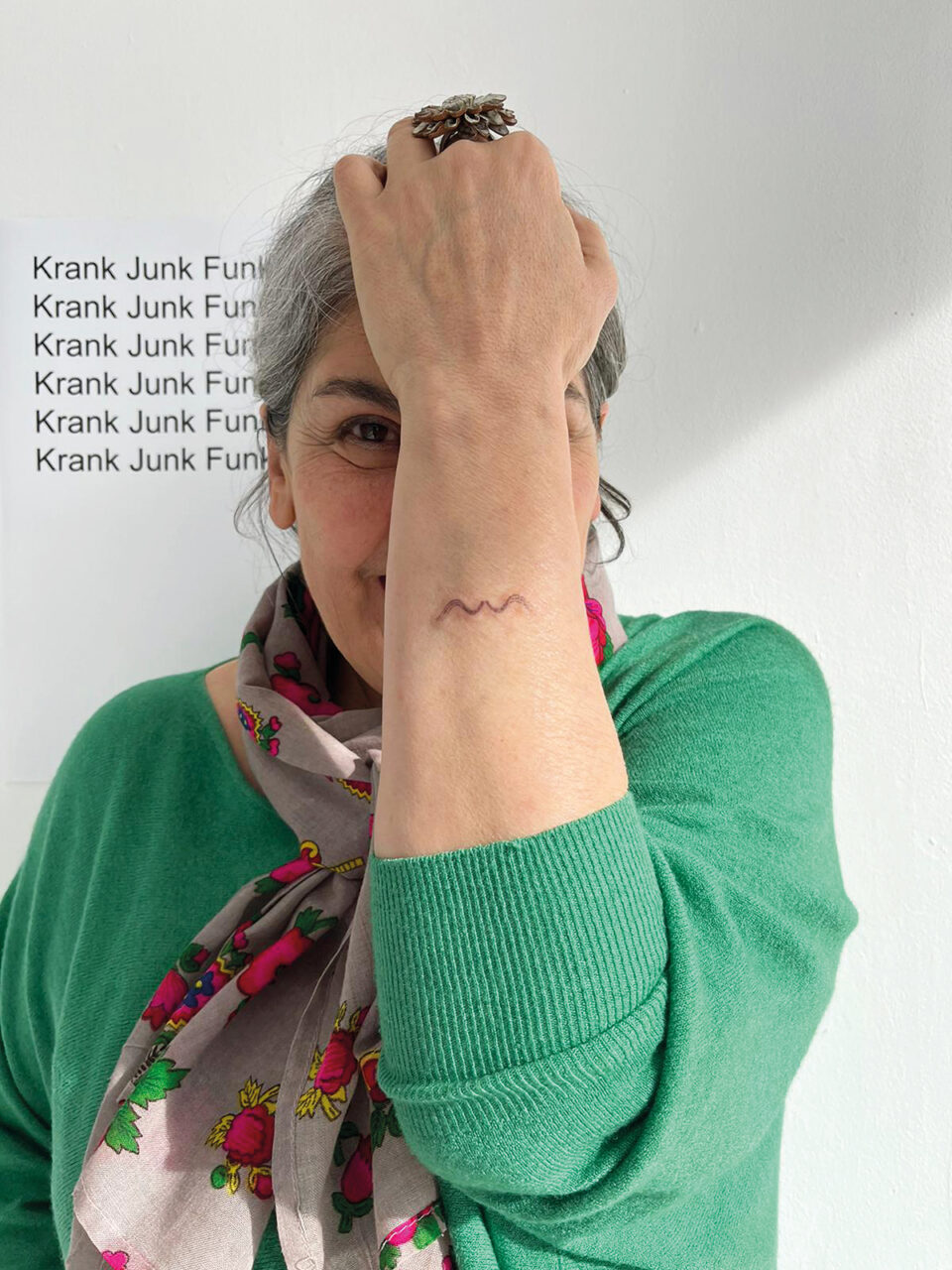 Im Hintergrund ein Kunstwerk von Laetita Eskens, Tattoo und Foto von Sojeong Kim